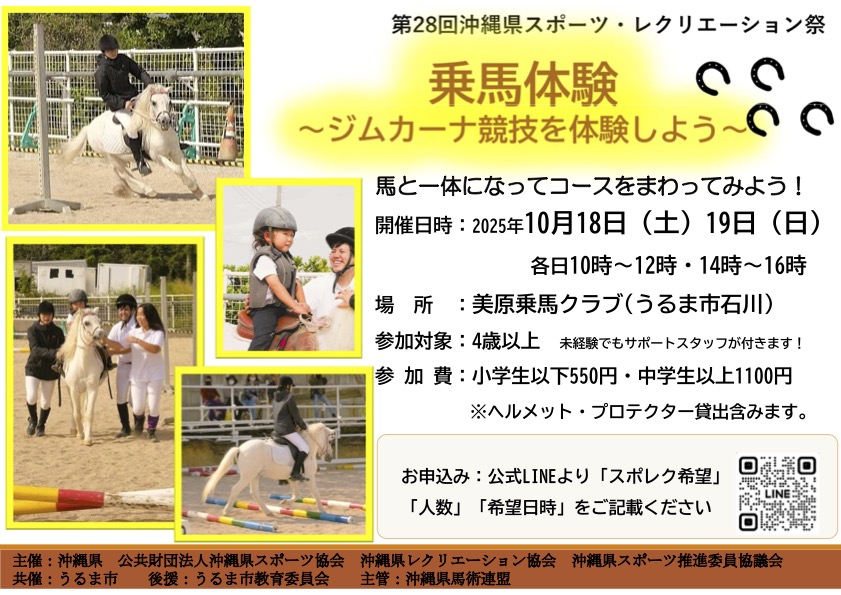 参加申し込み方法:美原乗馬クラブ公式LINEアカウントに「スポレク希望」と、人数、希望日時をご記入ください。